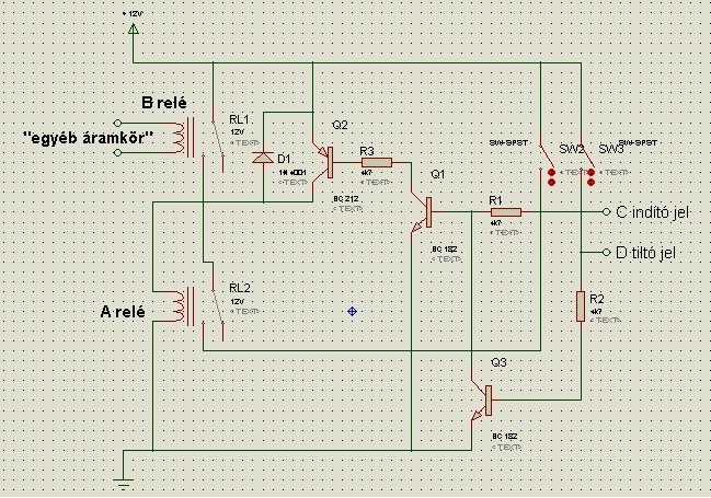 Igen az "A" relé vezérlését tranzisztoros kapcsolással szeretném megoldani. Nekem a gondom még mindig a tiltás jel feldolgozása. Tegyük fel van rövid +12v indító"C" jel. Ha "B" zárva akkor az "A" is behúzhat és ott is kell maradnia. De közben figyelni kell hogy a tiltó "D" jel milyen állapotban van. Mert ha +12v fesz van rajta akkor nem húzhat be az "A" hiába van zárva a "B" de ha már eleve öntartó állapotban van az "A" akkor a tiltó "D" jel hatására el kell engednie független attól hogy a "B" zárva van.