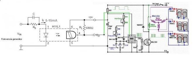Ha a GND-k közösíthetők, akkor akár közvetlen is vezérelhető lenne az 555. Vagy felhúzóellenállásos tranzisztorral. A H11L1 helyett egy 4N25 ( vagy hasonló univerzális ) optocsatoló nem lenne elég? Mekkora az 555-ös frekvenciája? S mennyi a frekvenciagenerátoré?