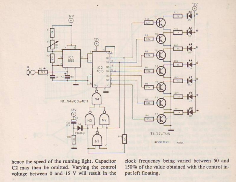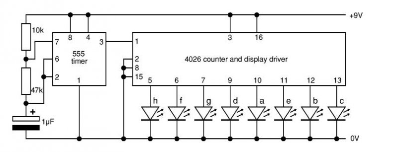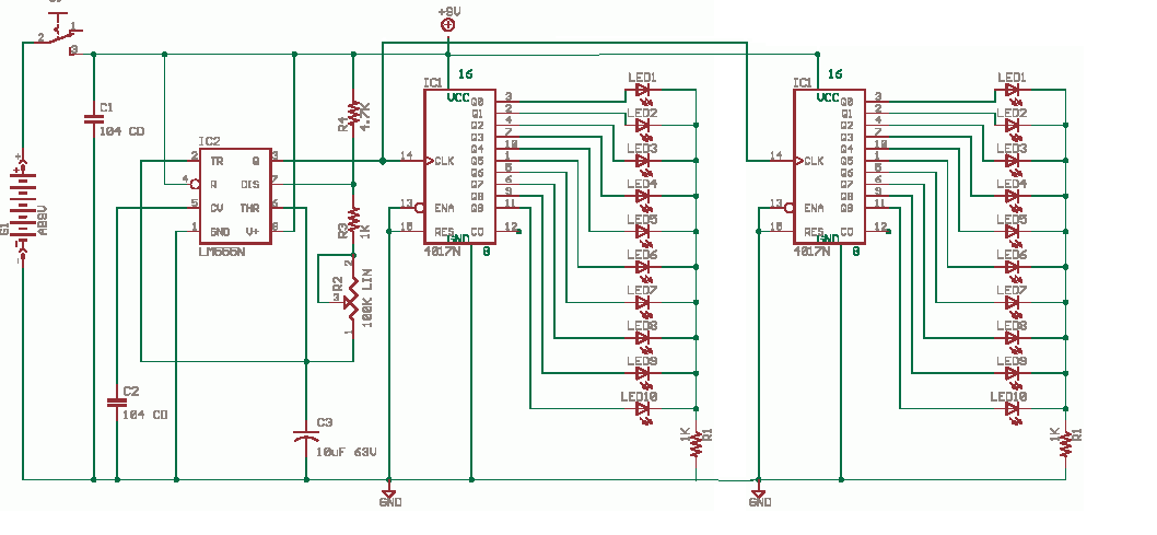 frekvenciával (ezt a kondenzátor értékének állításával változtatni tudod).A 4026 os IC egy 7 szegmenses kijelző meghajtó,csak a kijelző helyett LED ek vannak a kimenetére kötve.A LED-ek minden órajel hatására látszólag kaotikuson fognak változni. :yes: