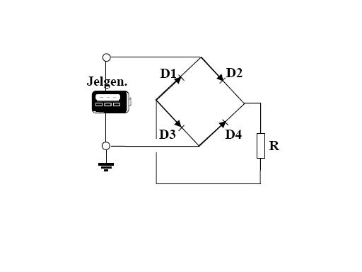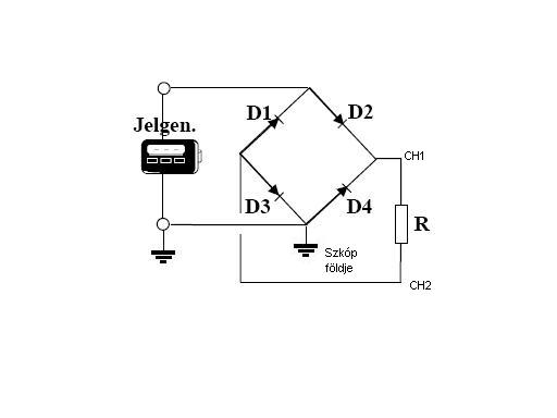 A gond, hogy a jelgenerátor egyik kimenete földön van, ha az ellenállásra rakod a szkópot akkor rövidrezársz egy diódát. Ha viszont az egyik és a másik csatorna földjét is rárakod a D3-D4 közös pontjára és a bemeneteket az ellenállás két végére elkerülöd a dióda rövidrezárását viszont a korrekt jelhez ki kell őket vonnod egymásból.