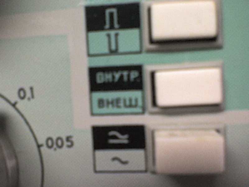 4. Gombok fentről lefelé: a) felfutó vagy lefutó élre történjen a trigger b) belső (ВНУТРЕННИЙ vnútrennyij) vagy külső (ВНЕШНИЙ vnyésnyij) jelre triggerelés c) AC csatolt vagy DC csatolt legyen a mérés.