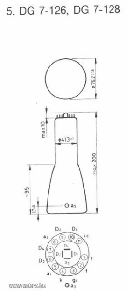 Hozzájutottam egy szkópcsőhöz, de nincs rajta, csak egy kopott Tungsram címke. A bekötését sikerült megfejteni (remélem), mivel a nyaka elég szépen átlátszó, de típust nem tudtam találni hozzá. Kérdésem, hogy tud-e valaki az alábbi adatokból valamilyen esetleges típust írni? 11 lábú 1,2: fűtés 3: G1 4: K 5: A 6, 7: lemez 8: G2 9, 10: lemez Képernyő átmérője: 69mm Nyak átmérője: 37mm Cső hossza (lábak nélkül): 155mm. Köszi, ha valaki veszi a fáradságot utánanézni.