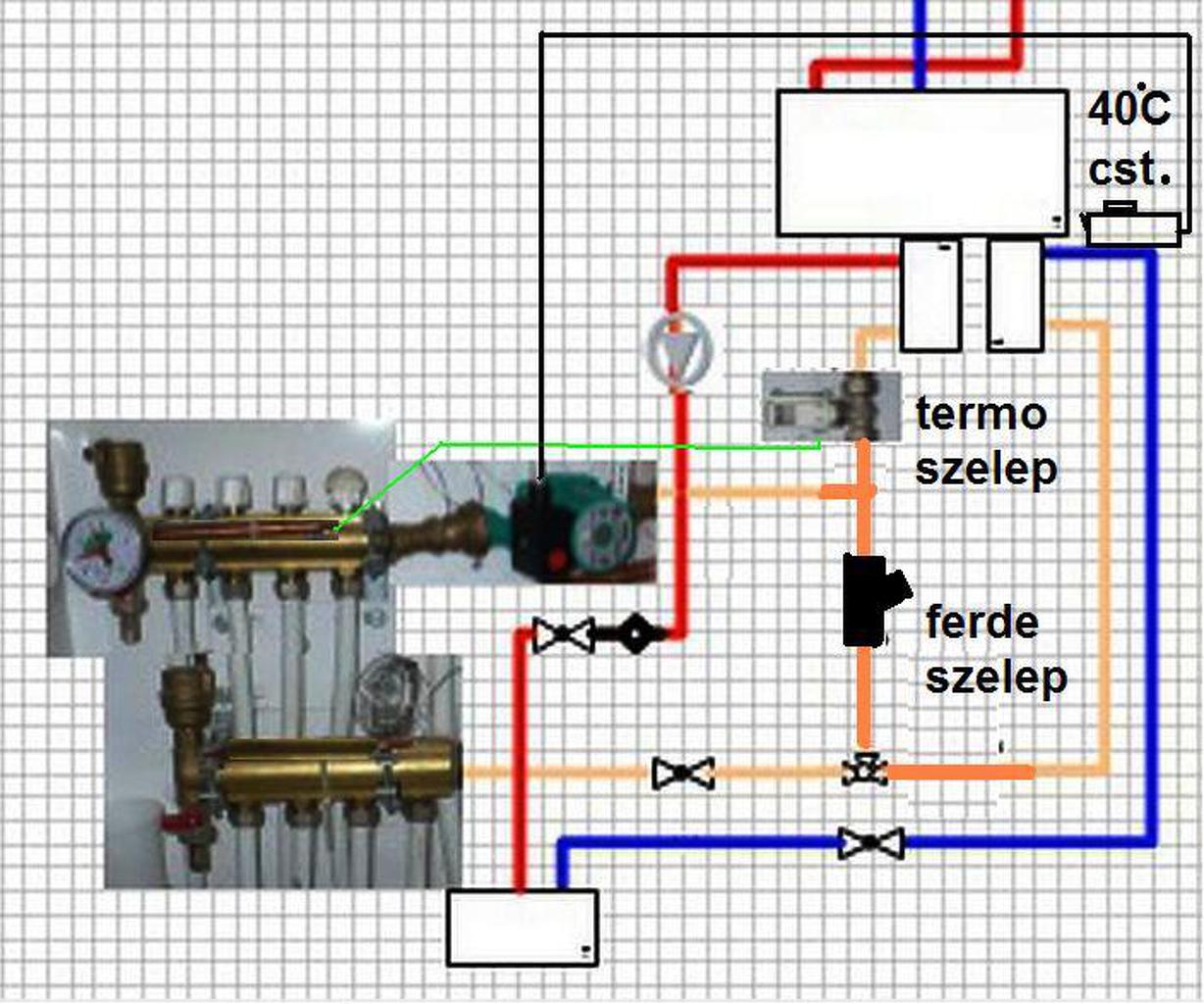 Szia Zoli! Csak félve kérdezném meg, hogy a vázolt elrendezés esetleg működőképes volna-e a mostani rendszerben. A padlófűtési szivattyúnak mindig mennie kell a HV miatt vagy nem is hasonlít egy lemezes hőcserélős megoldáshoz a primer kör teljesítmény elosztása? A thermoszelep a pf. gyűjtő-osztó visszatérőjén kontrollál vagy elnéztem a bekötést? A fittingek több helyen leszűkülnek a fő méret (22mm) alá ahol megnő a nyomás és a sebesség ami nem jó a tömegáram tekintetében a padlókörnek sem. Persze lehet, hogy rosszul ítélem meg csak ötleteltem volna egy nem túl nagy átalakítás felé.