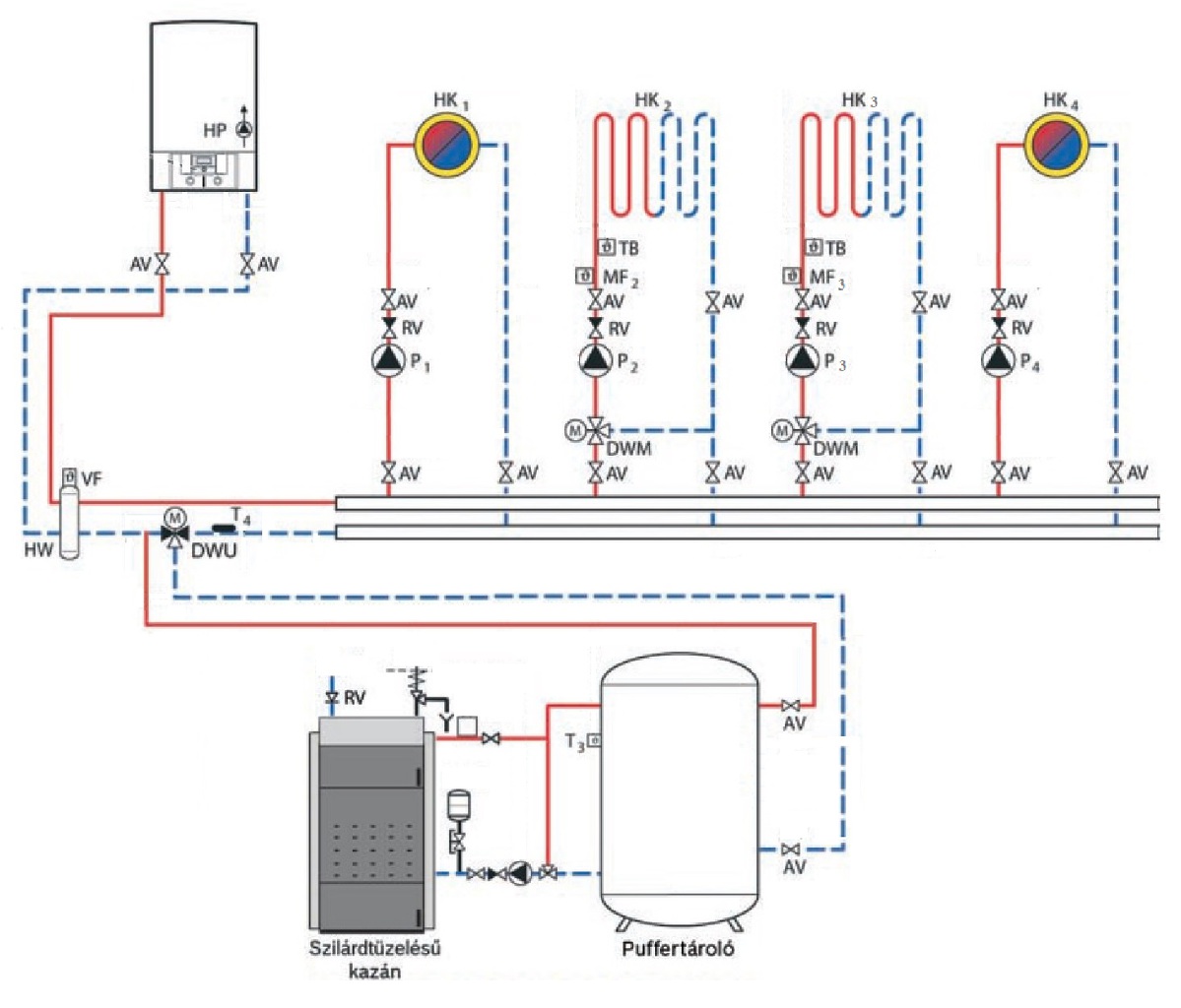 Az a puffer nagyon rossz helyen van. Ez így biztos nem jó. Írd le hogy melyik kört szeretnéd homogén offsetnek kinevezni (keveretlen). A többi kevert, vagy zónázott. Jó lenne tudni melyik kört hogy gondoltad. Gondolom van cirkó is. A puffer elvileg csak az elgázosítóhoz kell. Megoldható hidraulikus váltó nélkül is ha a cirkót is a pufferba kötöd. HV-val delta T-s pufferkizárást kell alkalmazni, amikor gázzal fűtesz. Hány literes a puffer? Mekkorák a hőtermelő teljesítmények? Melyik a fő hőtermelő? biztos lesz még pár kérdés