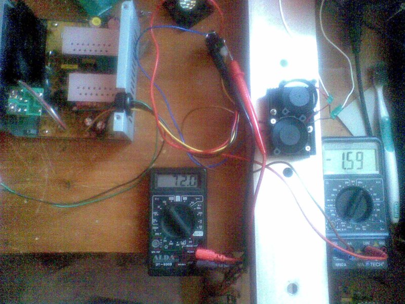 Jó néhány hétvége és elhalálozott alkatrész árán elkészültem a tápom első példányával.A donor egy Euro Case 300-as ATX volt.A kimenet a trafó áttekerése után +-36volt.Jelenleg a tesztelése folyik.Egyenlőre csak kis teljesítményű ellenállásaim vannak itthon(45 ohm 28W).Ezeken is egy nagy bordával és ventillátorral segítek de így sem bírják túl sokáig.A kimenő áram 1,59A. Egy kép a tesztelésről: