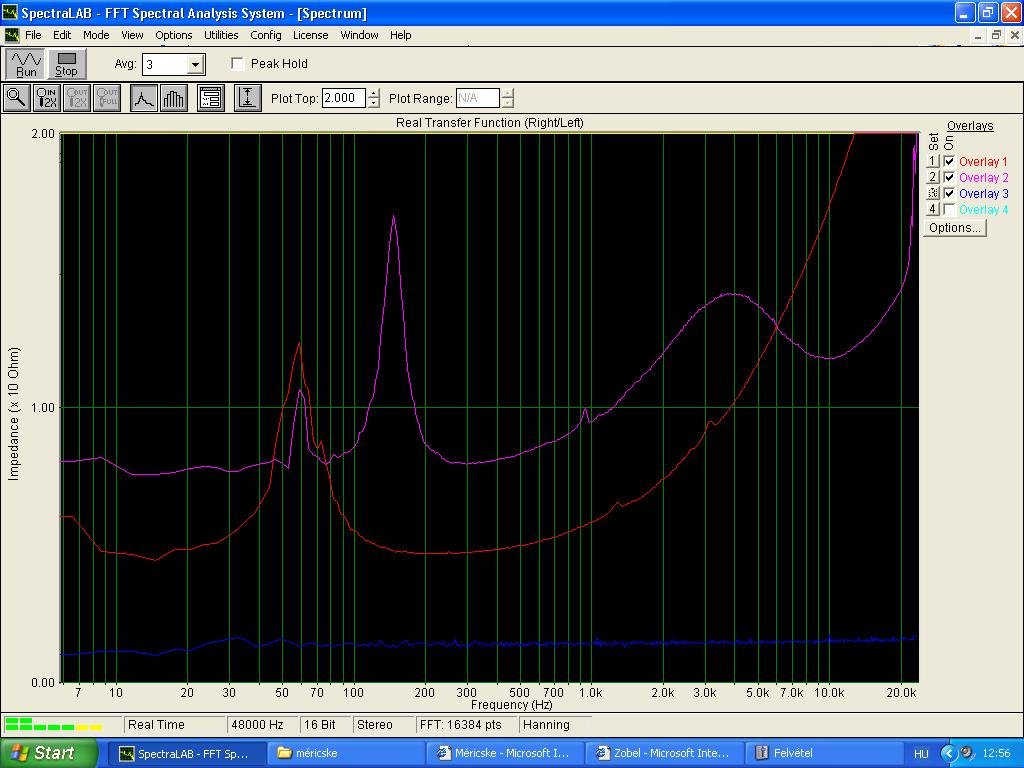 Az első az egy impedancia teszt volt. Ahol a kék csík, egy 1 ohmos ellenállás, a piros az egy Somogyi 10cm es mélyközép sugárzó 4 ohmos, a lila az egy aiwa kétutas hangfal. A következő két mérés egy kis magas sugárzó frekvencia átviteli tesztje lenne, az egyik SpectraLAB -al a másik Spectra PLUS programmal készült, mint látható van különbség. Kicsit bajba vagyok itt a hazsnálattal, ugyanis nem igazán látom át a működést, csak részben, jó lenne egy útmutató, hogy hogyan állitsam be a méricskét a hangkártyához, milyen beállításokra kellene odafigyelni, hogy hiteles legyen a mérés, illetve tisztábban látni a működést, sokat agyaltam rajta, de valahogy nem értem, az impedancia teszt még hagyján, azzal rendbe vagyok, hogy kell beállitani a méricskét és mit hova kell kötni, de a frekvencia átvitelnél gondba vagyok, mert mint a képen látható 300Hz-től lefelé egészen 0Hz-ig emelkedik a görbe, ez pedig nem jó, mert egy kis magassugárzó nem sugároz 0Hz-et, de még 50-et sem tehát ez a mérés hibás. Nincs valahol egy komplexebb leírás a használatról esetleg, mert én többször is végigolvastam a link-en szereplő dolgokat, de nem lettem okosabb. Az elv az megvan fejben, annyit értek, hogy van maga a zaj generátor, ami a hangszóróra ad egy fehérzajt, majd bekerül a hangkártya jobb oldali bemenetére, majd a hangszóró által sugárzott hang eljut a mikrofonig, majd ez felerősítve bekerül a hangkártya bal oldali bemenetére, a két oldal különbsége pedig megjelenik görbe formájában ha jól sejtem, ez lesz a hangszóró által lesugárzott frekvencia, amit le tud sugározni. De a görbe nagyon nem jót mutat. Néha úgy érzem, mintha egy 50Hz-es jel tüske lenne, talán brummos a méricske? Ez a "magas hangszoro freakiatvitel" - képen jól látszik. Szóval olyasféle segítség kellene, amivel beállithatom nullára a méricskét és biztosan tudhatom, hogy amit mér az csakis a hangszóró tulajdonsága és nem már külső tényezőké. Üdv.