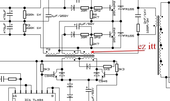 Értem. Akkor mondjuk, hogy normális a nyöszörgés adott tartományban, de valami szerintem akkor sem klappol, mert nem jön ki elegendő teljesítmény sehogyansem. Próbáltam cserélni meghajtó trafót, másik 494-est, ugyanaz maradt, próbálkoztam a primernél a soros kondi értékének csökkentésével, ez némiképp csendesítette a nyöszörgést, akkor próbáltam játszani a 1n5-kondival, tettem kisebbet, nagyobbat, 680pF től egészen 3n9 ig végigpróbáltam minden értéket, ugyanazon a terhelésen a 2n2 nél volt a legmagasabb a kimenő feszültség. Próbáltam nézni mi történik a 494-es kimenetén ott ahol a kis 945-ös tranyók bázisára megy, majd annak kimenetét, ami megy a meghajtó trafóra, majd az dupla dióda kimenetét is néztem, erről csináltam egy kis videót. A videón annyi történik, hogy lassan feltekerem a feszt majd letekerem, közben látszik mekkora feszültség megy ki 10 ohmmal terhelem, lehet hallani is amikor elkezd nyöszörögni, hátha eszedbe jut valami róla.