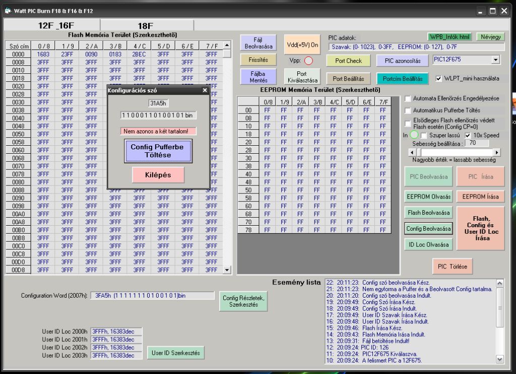 Építettem egy PK2 klónt, de nem tudom felprogramozni a PIC18F2550-et! A WLPT Vpp mini v4-et használnám a progi betöltésére, Watt progijával. Felismeri a pic-et, de amikor a hex-fájlt betallózom, azt a hibaüzenetet kapom, hogy a fájl nem kompatibilis a kiválasztott PIC-cel. Több hex verziót is próbáltam, mindíg ugyanaz az eredmény. Mi lehet a hiba? Hibaüzenet