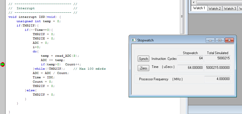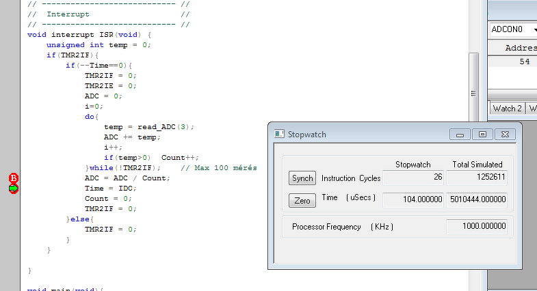 Beraksz a programba egy töréspontot (breakpoint), ott meg fog állni a program. A Window>Debugging>Stopwatch mutat egy stoppert, amivel mérheted az időt. A szimulátor órajelét helyesen kell beállítani.