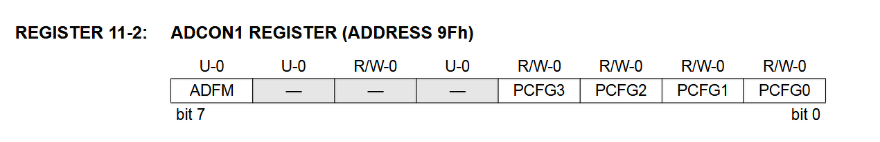Köszönöm a segítséget ADCON1=14; el működik egyből. Viszont most szeretném megérteni a 14-es decimális szám miből jött ki (1110)? Csatoltam az ADCON1 regiszter képét. És egy újabb kérdés "ADCON1.RB1" hol található milyen dokumentációban, ez így megadható? Nagyon régen tanultam PIC-et programozni és akkor is assemblyben. C nyelven csak amit össze tudok szedni tudást innen onnan ezért is a kérdések. |