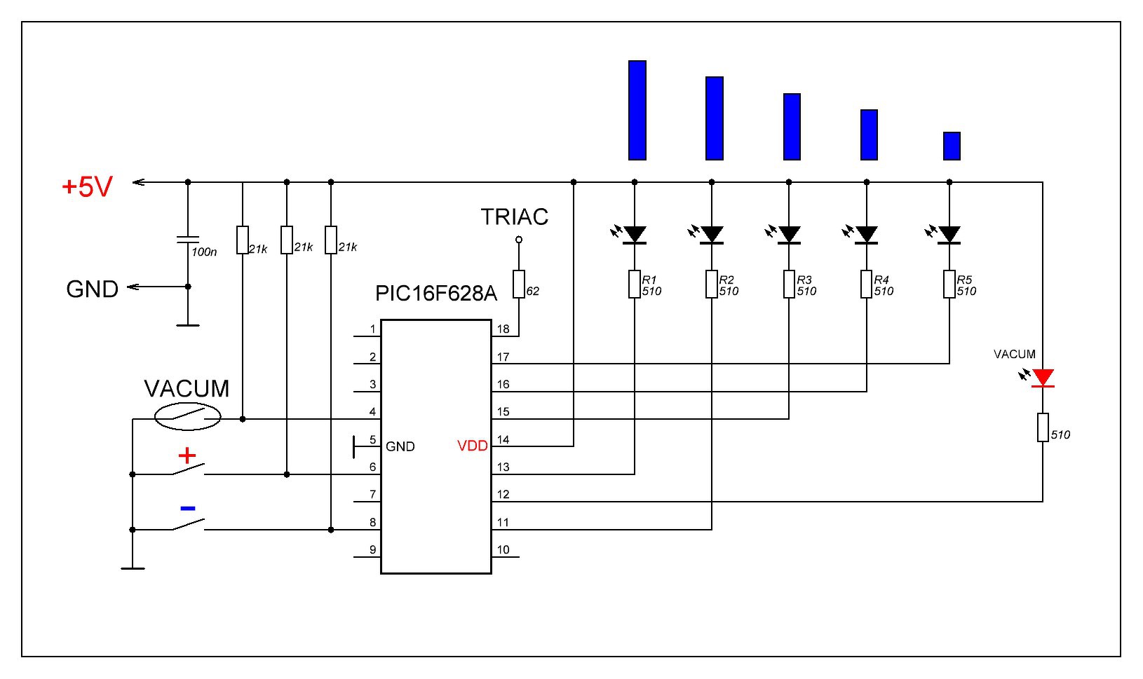 Alapból nem kap jelet a triak. Ha megnyomoma + gombot, akor ad egy ygenge jelet, igy lassan forog a motor. Nem értem hogy a fazon miért így csinálta, a gyári panelből ki kell venni a rossz IC,t és betenni helyette a PICet. Mondjuk a PIC 9es lábára megy a vákum kapcsoló.