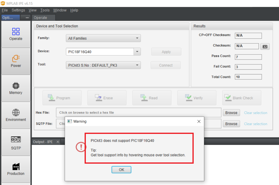 PIC18F16Q40-et szeretnék programozni PicKit3 illetve MPLAB IPE V6.15-tel de nem tudom működésbe hozni. Az alábbi hibaüzenetet dobja: