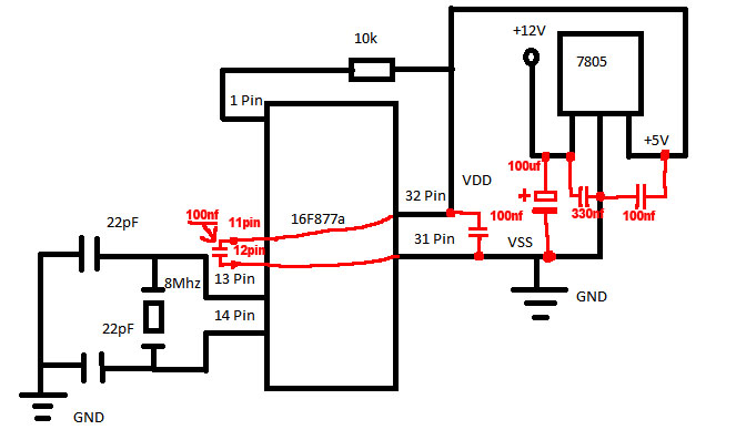 Egyébként mostmár jó. Összeraktam ahogy írtátok de nem gondoltam volna hogy a 7805 in és gnd lába közé nem rakok egy 100uf kondit ez már összezavarja az egészet. Beraktam és már így működik. Csak az eddigi tapasztalatom az volt hogy nem kell mert a 16f818 és a16f84a tökéletesen működött ezek nélkül is. Elnézéseteket kérem.