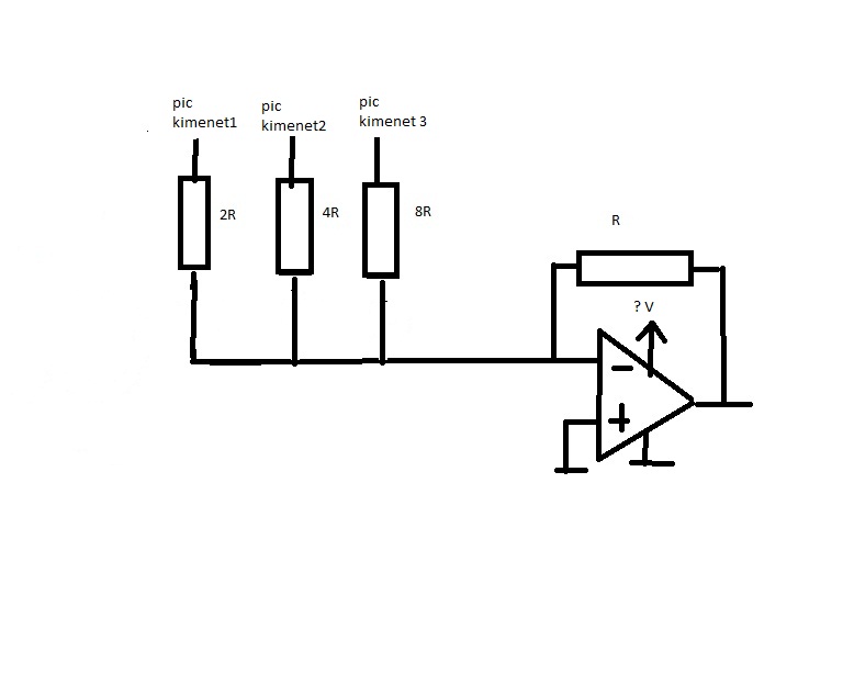 fordított sorrendben: - A pic kimenete nem megy tönkre, ha az ellenállások nem túl kicsi értékűek. A kicsi értékű ellenállások alkalmazása amúgy sem jó, mert a kimeneti meghajtó FET -ek Rds ellenállása (ill. szórása) összemérhető lenne velük. - A súlyozott ellenállások használata nem túl célszerű, mert nehéz beszerezni pontos és az arányokat is betartó értékeket. - Az R - 2R létra áramkör jól működik, könnyű beszerezni (pl.: 1k0 és 2k0 vagy 1k0 és 1k0+1k0). 2 bitre legalább 10%, 3 bitre legalább 5% -os ellenállás kell. - Az áramköri elrendezésed -5 ..0V közötti feszültséget ad ki. Egy RealToReal erősítő már -5V - +5V táppal jó a feladatra. - Ha az R - 2R létrát használod, akkor a kimenő feszültség +5 .. 0 V között lesz, erre egy +1 erősítésű műveleti erősítő csatlakozhat a kimenő ellenállás csökkentésére. A műveleti erősítők általában nem engedik meg a tápfeszültségig felvinni a bemeneteket, így 1 - 2 volttal magasabb tápfeszültséget kell alkalmazni.