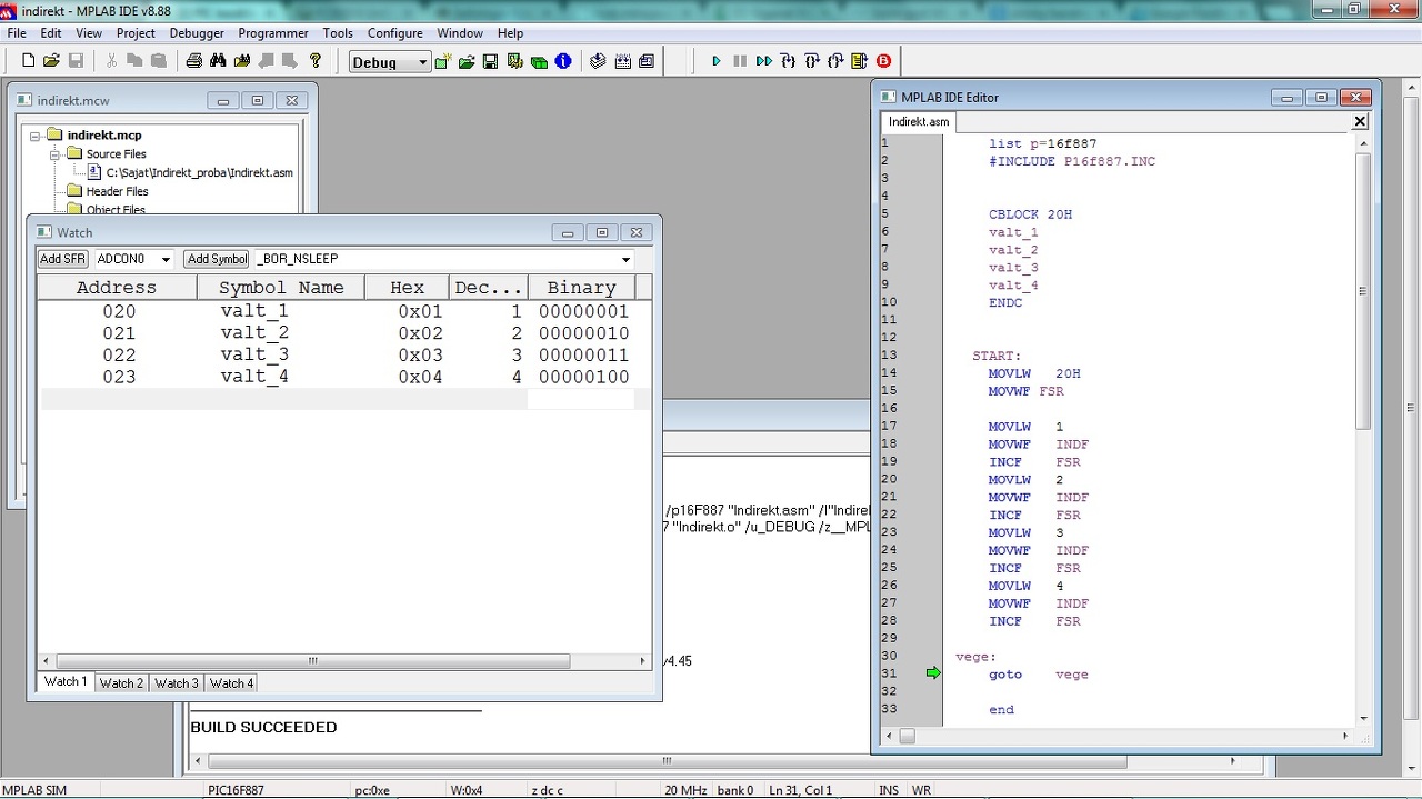 Ha jól emlékszem, az INDF nem látható a watch ablakban. Azt nézd meg, hogy az a regiszter, ahová az FSR mutat, az megkapja-e az értéket, amit az INDF-be írsz.