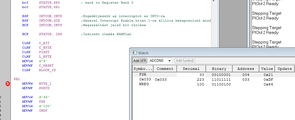 PICkit 2-n (PIC16F887) próbálgatom az indirekt memóriacímzést de nem sikerül. Debuggoláskor látom, hogy az FSR megkapja a megfelelő értéket, de a MOVWF INDF már nem működik. Próbáltam a CLRF INDF-t és MOVWF 0x000-t is, egyik se ment. Mi lehet a probléma?