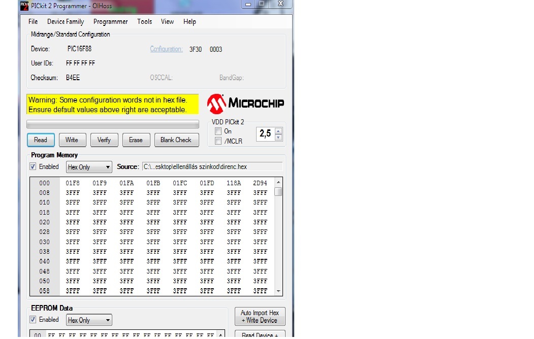 OK, ez az eredeti hex-ben lévő beállításokkal megy, nem tudom, a PK2 szoftvere miért nem ette meg, én az MPLAB-ba importáltam, majd exportáltam Neked ...!