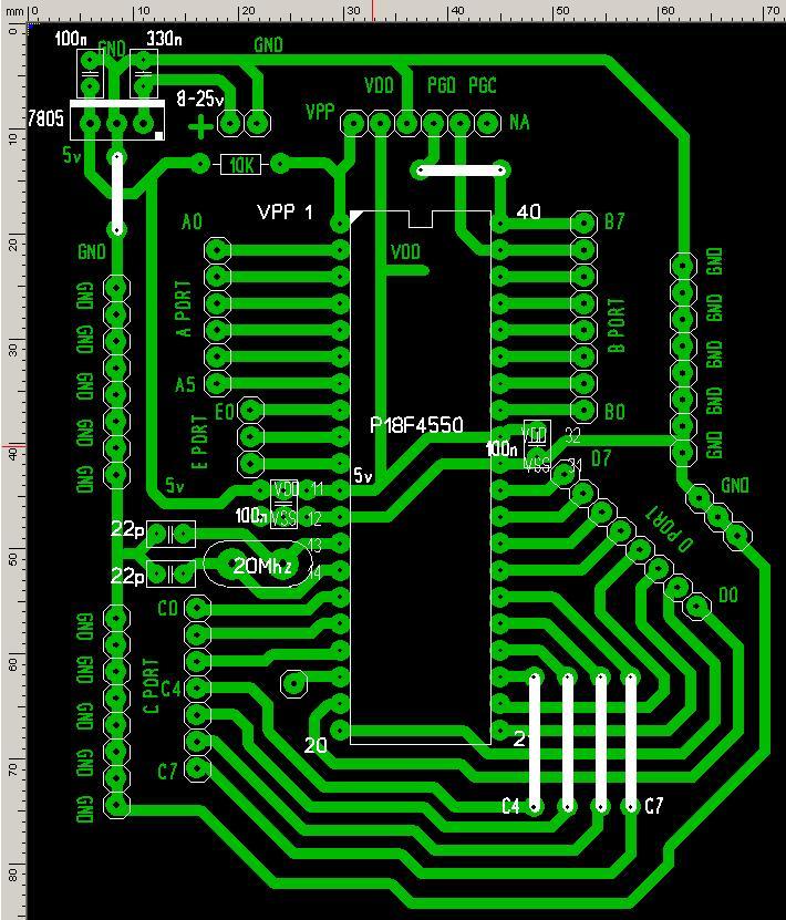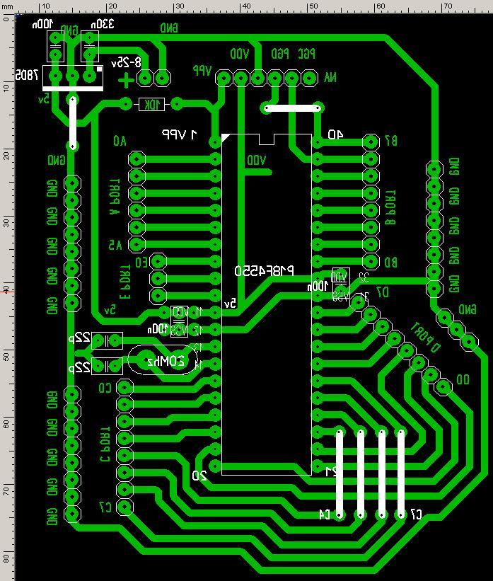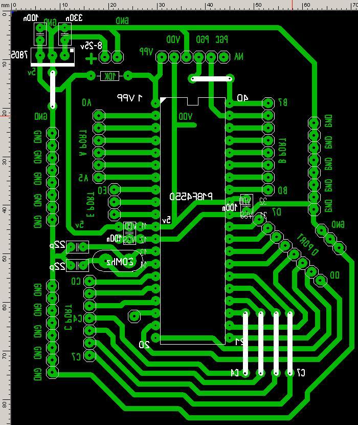 Ha ez a forrasztási oldal tükörképe, akkor szerintem a PIC lábkiosztása nem fog stimmelni. Ha pedig nem tükörkép, akkor a 7805 és a feliratok nem lesznek jók.