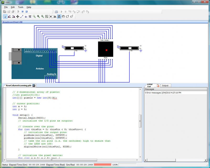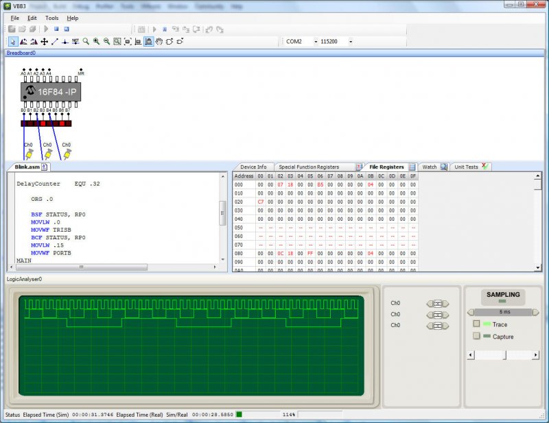 Amugy en ugy szoktam az ilyeneket csinalni, hogy egy hasonlo PIC-en fejlesztem ki az algoritmusokat es utana mikor minden mukodik ahogy szeretnem atultetem a vegleges chip-re es csak akkor keazdem el tesztelgetni / debuggolgatni az aramkoron. Utana is meg lehetnek problemak de sokkal kevesebb, mint ha amugy csinalnam. Megjegyzem a Proteus nevu cucc sokkal kifinomultabb, mint ez, es abban rengeteg alkatresz mar eleve benne van, csakhat az fizetos es nem berbol es fizetesbol eloknek van kitalalva az ara...
