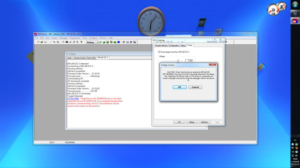 És ha azzal futtatom le akkor ez történik : MPLAB ICD 3 detected Connecting to MPLAB ICD 3... Running self test... Self test completed Firmware Suite Version...... 01.26.33 Firmware type......................Midrange MPLAB ICD 3 Connected. ICD3Err0045: You must connect to a target device to use MPLAB ICD 3. Test interface PGC clock line write succeeded Test interface PGD data line write succeeded Test interface PGC clock line read succeeded Test interface PGD data line read succeeded Test interface LVP control line test succeeded Test interface MCLR level test succeeded ICD3Info0001: ICD3 is functioning properly. If you are still having problems with your target circuit please check the Target Board Considerations section of the online help.