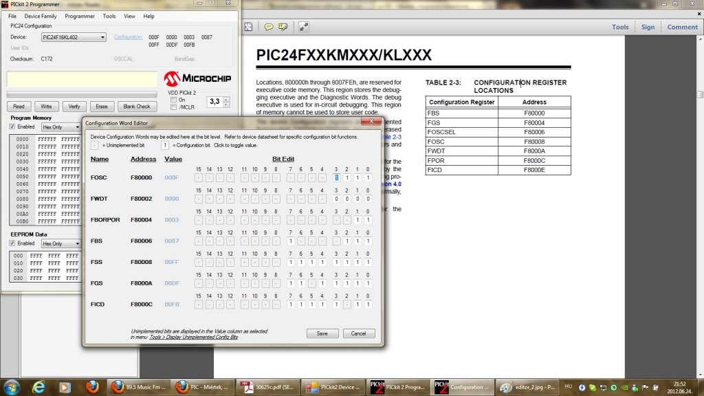 Annyi nem tiszta még az editorban, hogy van egy CfgAddr sor. Ide ha azt írom, hogy 0x001F0000 akkor a 2.61es PK2 progiban a Config adress F8000-től megy. Ez jó is, mert amikor az editorban F8000 lett megadva akkor a progiban valami 7C000 körül indultak a config word-ök. Ezt a részt nem teljesen értem, hogy jönnek ki ezek a címek. Most ami a problémám, hogy a config word-ök össze vissza vannak. Csatoltam pár képet a jelen állásról. Az lenne a kérdésem, hogy lehet felcserélni ezeket? Pl az FBS most F80006-on van F80000 lenne a jó. Valamelyik configos scriptet kellene átírni? Illetve én az adtam meg a config words sorban, hogy 7. Ez jó így? Illetve látszik, hogy kettesével vannak a címek és nem megy E-ig csak C-ig.