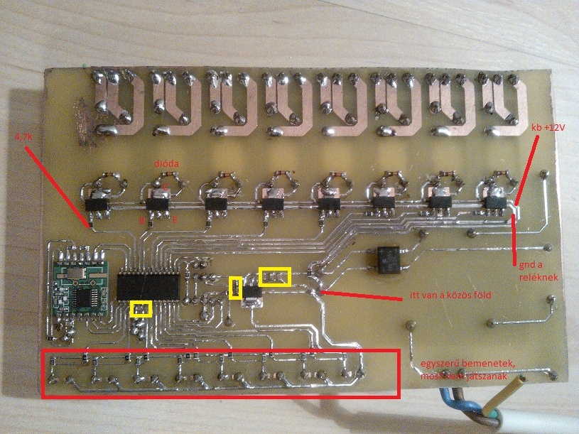 Úgy gondoltam, hogy a relék áramait a digitális részével a kondi - lábára folyatom össze, továbbá a digitális részeket egy kicsit előtte közösítem (nem tudom, hogy ez mennyire korrekt megoldás). Arra törekedtem, hogy a relének a vezetékei közel és párhuzamosan fussanak. A képen a sárgával jelöltem az SMD kondikat, mert nem látszanak jól. Azt hangsúlyozom, hogy nem vagyok profi nyáktervező, úgyhogy lehet, hogy nagy baromságok vannak a képen.