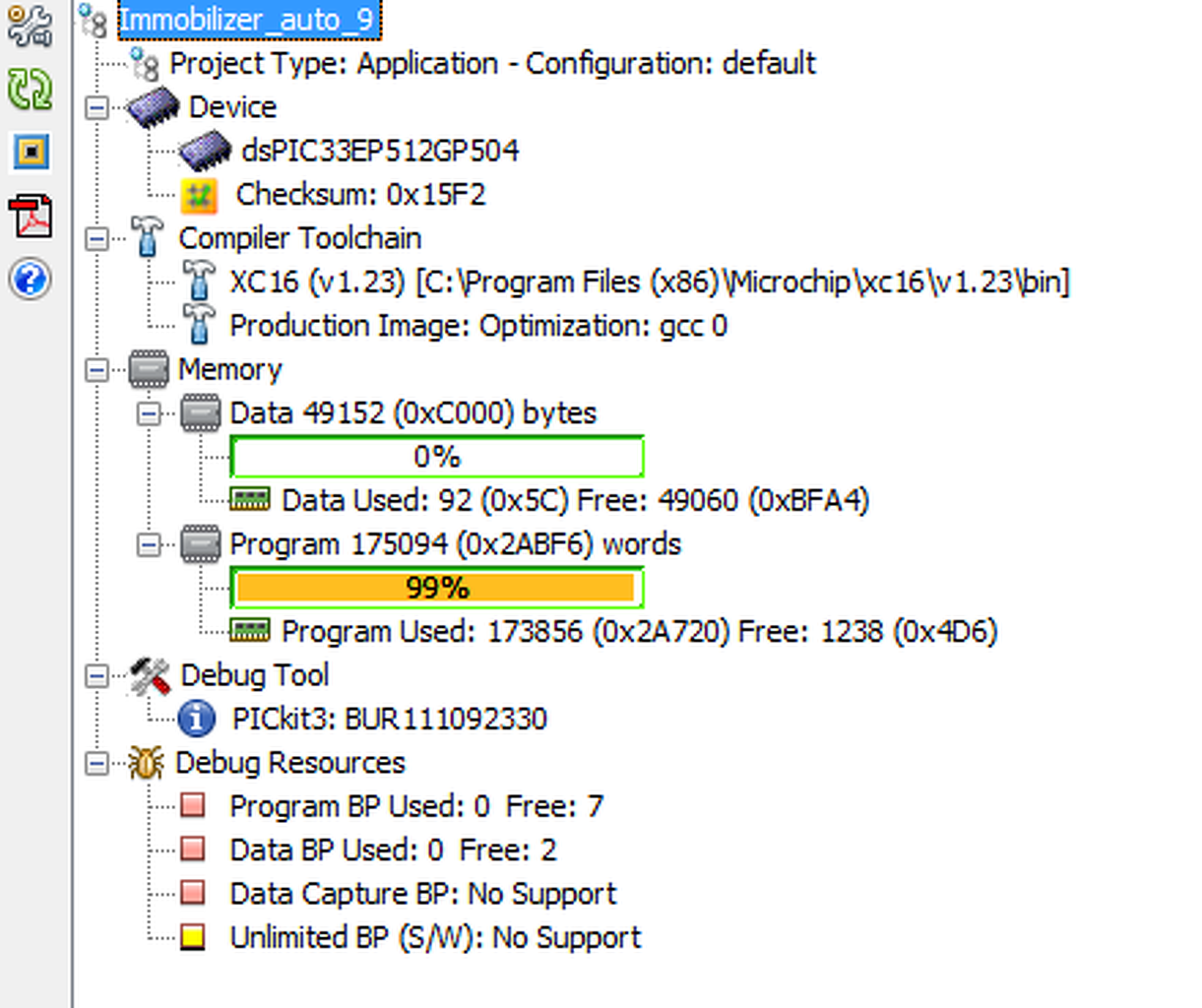 dsPIC33EP512GP504-et használok, melynek 512kB programmemóriája van. Ennek ellenére a dashboard-on azt írja hogy a programmemóriája 175094 szó, vagyis kb 350kB. Azaz hiányzik még legalább 160kB és mint azt a sárga csík is mutatja, igencsak szükségem lenne rá