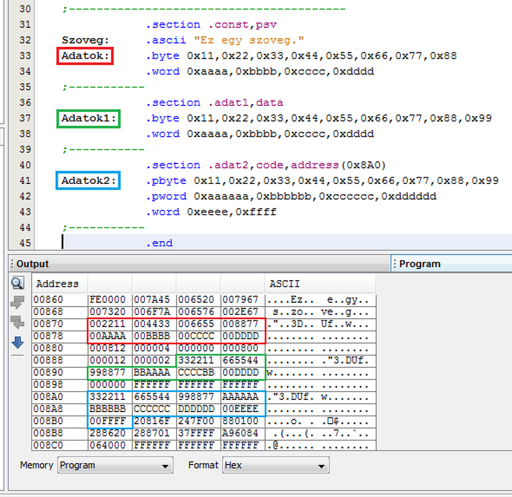 Piros: A PSV területen helyezünk el konstansokat. A felső bájtok nem használtak. (Itt 0.) Zöld: Inicializált változókat helyezünk el. Az adatok minden bájtot kihasználnak, viszont területfoglalás nemcsak a ROM-ban van, hanem a RAM-ban is, ugyanis a változók a RAM-ban vannak, de a kezőértékük a ROM-ból töltődik be. Kék: Programkód ill. konstansok elhelyezése. Egyaránt tudunk a PSV-nek megfelelően, ill. minden bájtot kihasználva adatokat tárolni. (1 bájt, vagy 3-bájtos szó) Neked - szeintem - a Code szekcióban történő bájtos adatmegadás lesz a legmegfelelőbb. (.code / .pbyte) A hozzászólás módosítva: Jún 6, 2015