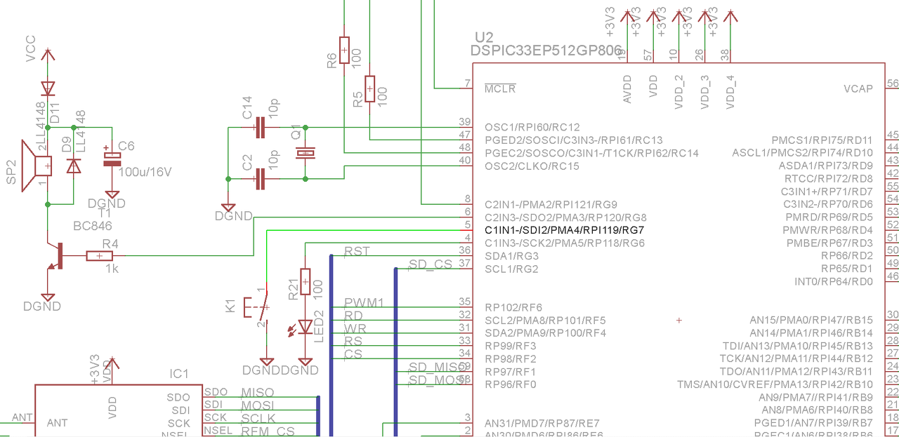 Idézet: „C1IN1-/SDI2/PMA4/RPI119/RG7” Azaz az 1-es komparátor bemenete, az SPI2 bemenete, és a párhuzamos port egyik bitje van rá kötve. A komparátor lekapcsolva, mert a CM1CON regiszter CON bitje 0. Az SPI2 lekapcsolva: SPI2STAT regiszter SPIEN bitje 0. És a párhuzamos port is lekapcsolva: PMCON PMPEN bitje szintén 0. A panelon nincs zárlat a láb körül a föld felé, sem máshova. Tönkre nem mehetett a PIC lába mert soha nem kapcsolódhatott oda feszültség sehonnan, hiszen csak egy szimpla nyomógomb van rajta a föld felé. Az errata nem ír hibát ezzel a lábbal kapcsolatosan. Érdekes...