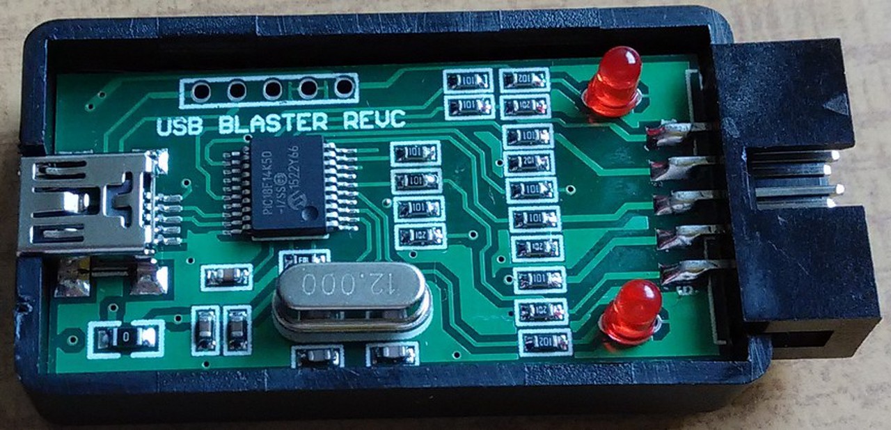 Felnyitottam egy Altera USB Blaster klónt (az Altera CPLD-k , hogy meglessem, mi van benne. A kicsi kínai dobozkában a kicsi kínai panelon meglepetésemre csak egy Microchip PIC18F14K50. csücsül egy félmaroknyi ellenállás társaságában. Ennek ellenére működik, legalábbis egy Altera MAX II kategóriájú CLPD-t sikerült felprogramoznom vele. Az ötlet nyilván erről a japán oldalról származik, ahol PIC18F2550-nel építettek JTAG eszközt az Altera CPLD és FPGA eszözök programozásához. A kapcsolást és a firmware-t később PIC18F14K50-re is adaptálták (lásd a 2.回路図 pontot az említett honlapon). Szép munka, bár a PIC18F14K50 esetében a sok ellenállást megspórolhatták volna, ha nem 5V-ról, hanem 3,3 V-ról járatják a mikrovezérlőt! Erről bővebben: Link