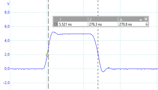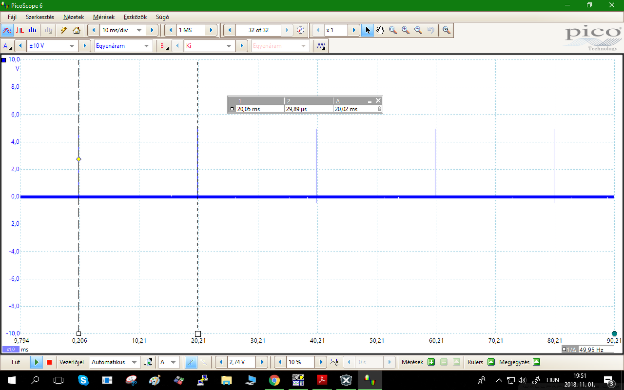 Ehhez beállítottam a TMR1 megszakítást 20 ms-ra a TMR2-őt pedig 1 us-ra. TMR1-ből indítom TMR2 megszakítást 20 ms-onként. A rendszer órajelem 32 MHz. Ilyen módon a kimeneten mért jelet nem sikerült 4,5 us alá vinnem. (Ekkor a megszakításban csak egy kimenet állítás van, meg az interrupt flag törlése.) Így megpróbáltam egy olyan variációt is, hogy a 20 ms-os megszakításba tettem egy szoftveres késleltetést (tudom, hogy nem szép dolog), így 270 ns-ig képes voltam lecsökkenteni a kimeneti jel magas szintjének idejét. (A felhasznált PIC 16F18857 típusú)