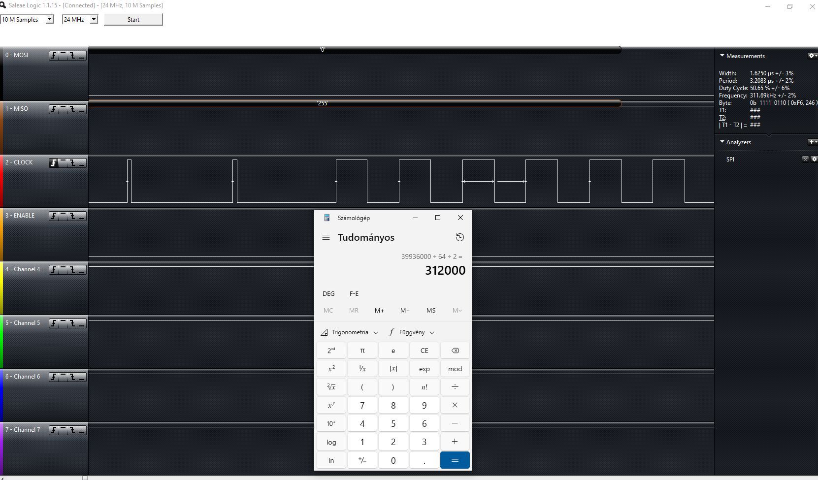 Sajnos rossz helyre tettem fel a dsPIC33FJ SPI gondokat. Vélertlenül az Arduino-ba. Az eredmények SPI-n: Üdv Mesterek! Megjött az analizátor. Nem volt egyszerű életre keltenem, sokszor már azt hittem tönkre tettem, de nem, még megy. Az SPI-vel kapcsolatban (Arduino-n is van! ): Az eddigi legjobb eredményemet a csatolt képen láthatjátok. Sajnos NAGYON nem ok az egész! A kód t1 interruptban 100Hz-enként írna és olvasna a RAM-ba. Szimulációban minden fényes. Szóval a képen az órajel nem jó. Az elején igen rossz, a 3. byte -nál szedi össze magát. A kód úgy működik, hogy mikor az SPI-re ír, az először engedélyezve van, /CS láb lehúz, majd írás, utána SPI nincs engedélyezve. Kipróbáltam úgy is, hogy az engedélyt elsőnek megadtam, soha nem állítottam le, de nem lett jó. Bár most belegondolva azért is lehet, mert 1x elfelejtettem az analizátor GND-t csatlakoztatni. Lehet épp akkor... Az eredmény olyan, mintha az órajel nem szedné össze magát időben. Az utolsó byte-ra kijön a 320KHz, amit beállítottam. Fcy/(64*2) Fcy=39936000.(utasítás frekvencia) Ez legalább jó. A képen a MOSI vonal teljesen halott. A másik probléma az, hogy a képen mintha olvasni szeretne. Kimenne az instrukció (ha jó lenne), majd a 16 bit cím. Node írni is kellene neki, minden másodiknál, de az meg sem jelenik. Annak instrukció (8 bit), cím (16 bit) + 8 bit adat-nak kellene lennie, szenben a képen láthatóval, innen gondolom, hogy az írás egyáltalán nem jó. Komoly gondok vannak itt úgylátom, de majd ránézek holnapután, mert ma Whisky-van. Elég sokat lehet kínlódni egy ilyennel, de az analizátor eddig sokat segített. Az Enable láb jó, néha az óra is, a többi kuka. Legalábbis edig. Ha van valakinek tapasztalata/ötlete szívesen fogadom! Köszi!