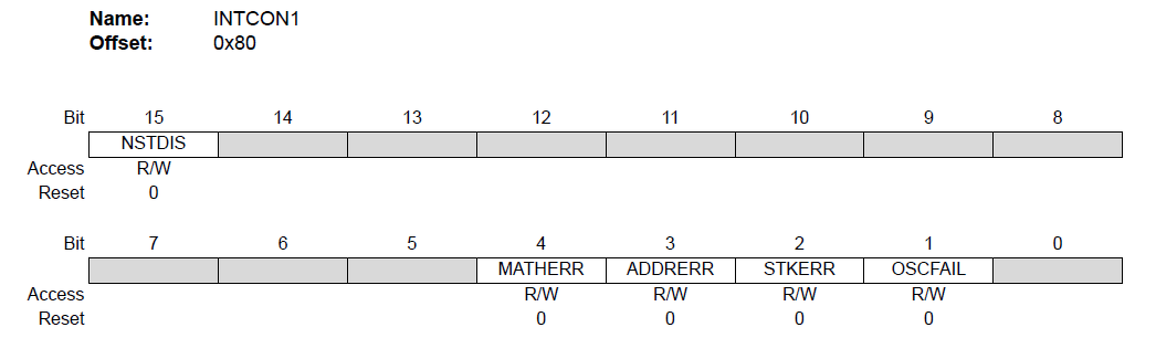 Az INTCON1 reset esetén törlődik, de ez a trap megszakítások státuszát tárolja. Ha a program a reset előtt nem fut bele a _AddressError, _HardTrapError, _StackError, _MathError, _SoftTrapError megszakításokba, akkor ebben a regiszterben sem fog egyik bit sem beállítódni.