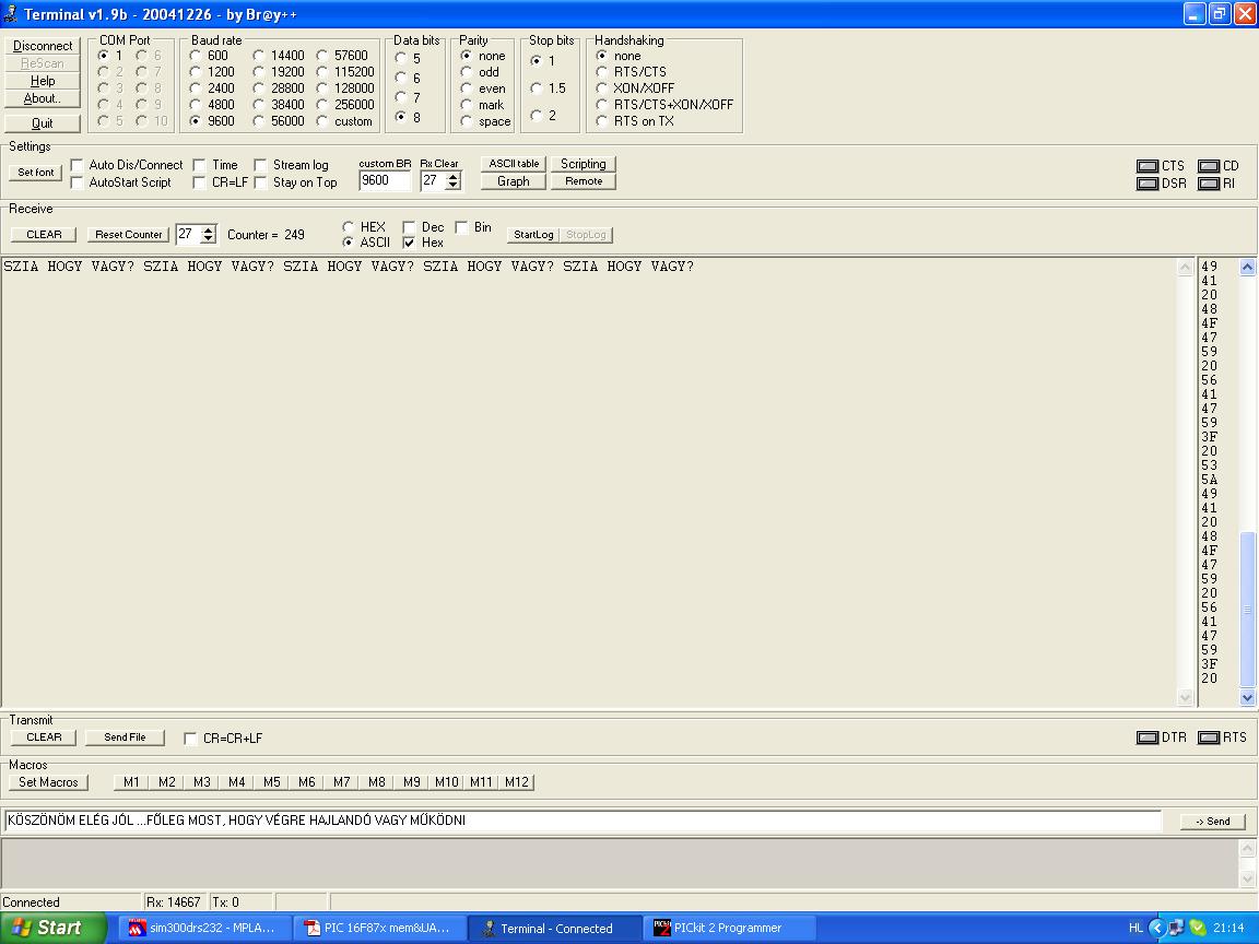 Most esett le miért van "ekkora" érdeklődés az én kis gagyi programommal kapcsolatban... Gondolom a feltett kép fáljnevéből arra következtettetek hogy ez egy teljes értékő "CHAT" program, tehát PIC / PC PC / PIC irányú "beszélgetős" progi. Ez félreértés, csak a kép mentésekor PIC CHAT nek lett elnevezve a fájl, a terminal programban meg (örömömben hogy működik végre..!) írtam egy választ a PIC nek, ami természetesen nem lett elküldve sehová. Sorry ha valakit félrevezetett volna ez, nem volt szándékos.