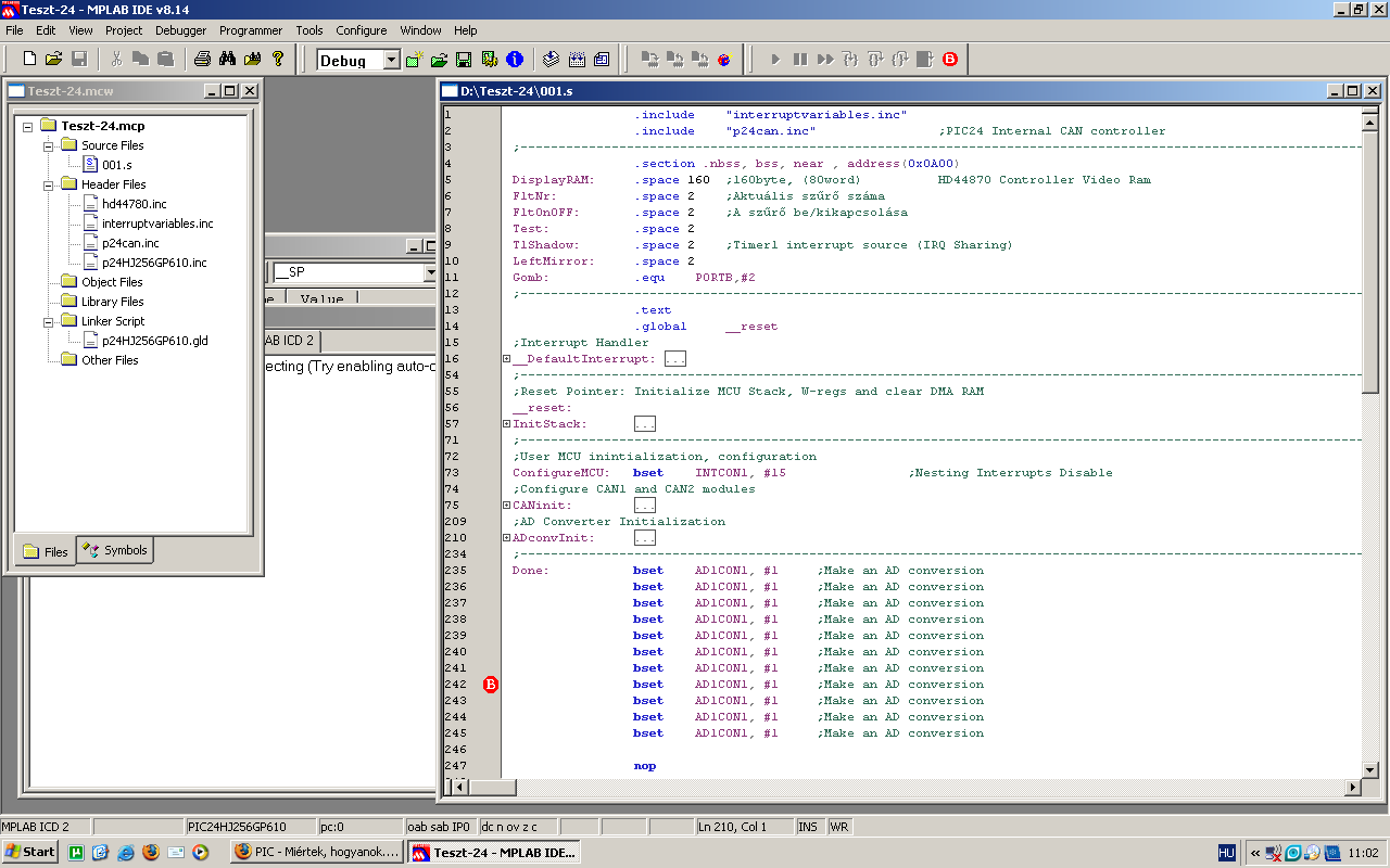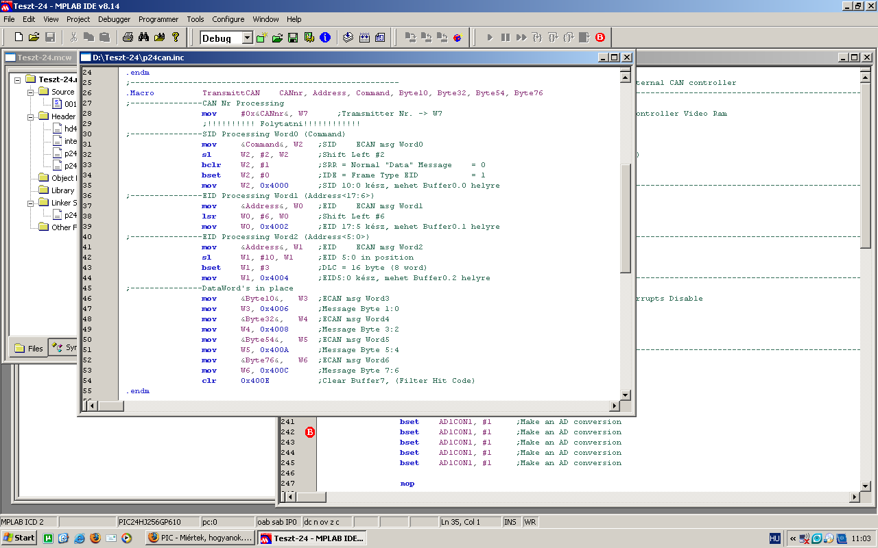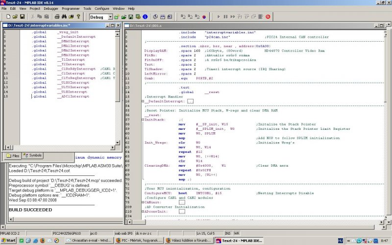 Stack kezelés: Ez a jövő. Ugyanis a hardver stack korlátozza az ugrások mélységét. A mezei memóriában tárolt meg nem. A deklarálásoknál mindig a cimkével kell kezdeni, utánna kettőspont. Ez minden cimkére igaz amit asm-ben nyomsz. Berakok egy képernyő mentés azon kultúráltabban látszanak a dolgok. EZ az aktuális Autó project-em ma reggeli állása. 11. sorba beraktam a "Gomb" nevű cuccodat. Gomb mögé kell a kettőspont. Nekem ez a software Stack gondot okozott az ICD2-vel Ő is a 0800 területet akarta használni. 4. sorban látod azt a ".space" nevű részt. Na az az összes kezdő változót felpakolja nekem pl 0A00-ra. Így már nem lesz gondod. Ezek után 5-10-ig változók deklarálása. A kezdéskor nem értettem hogy a Watch window változó listájában mé nem jelennek meg a saját változóim. 4. sor és az 5-10.-ig mutatott példával megjelennek. Anno kellettek, jelenleg nem használom őket de hogy a forma szem előtt legyen benne tartom. Lásd most neked jól jön. Ha mindennel megvagy jön egy .text fordító-direktíva. EZ mutatja hogy mot már a kód jön. Én utánna raktam be a megszakítás kezelőt, de teheted akárhová a helye nem lényeges csak az hogy az egyes megszakítások cimkéi a megadottak legyenek. Tehát bárhová teheted "__ADC1Interrupt:" cimkét csak legyen definiálva előre. Erre van nekem az 1. sor interruptvariables.inc nevű sora. Ez egy txt file amiben az van pl hogy: .global __ADC1Interrupt 57-70-ig pedig az említett InitStack, utánna az Init_Wregs (ezek kellenek mindenképpen), és mivel én használok DMA-t ezért én a ClearingDMA résszel törlöm a 0x4000- kezdődő részt ami DMARAM is egyben. Hát röviden ennyi. Ha ez megvan akkor el lehet kezdeni a konkrét inicializációt. Ez a láb kimenet, az meg bemenet, AD konverter, stb stb... Remélem segítettem. És még valami. Ha makrót definiálsz akkor ott nincs utasítás. .Macro Gomb Data0, RegNr mov &Data0&, W&RegNr& .endm Ezzel a makróval azt szeretném neked mutatni hogy paraméterezheted is. Igy futtatod: Gomb #0x0123, 2 Ez így a #0x0123 értéket beleteszi a W2, be mert RegNr paraméterként ez lett megadva. Mellékelem két képet. A 001 amin van az amiről beszéltem, a 002 meg az ECAN buszom egyik kommunikációs makrója. Szóval azt hiszem nekem már elég sok minden sikerült benne...