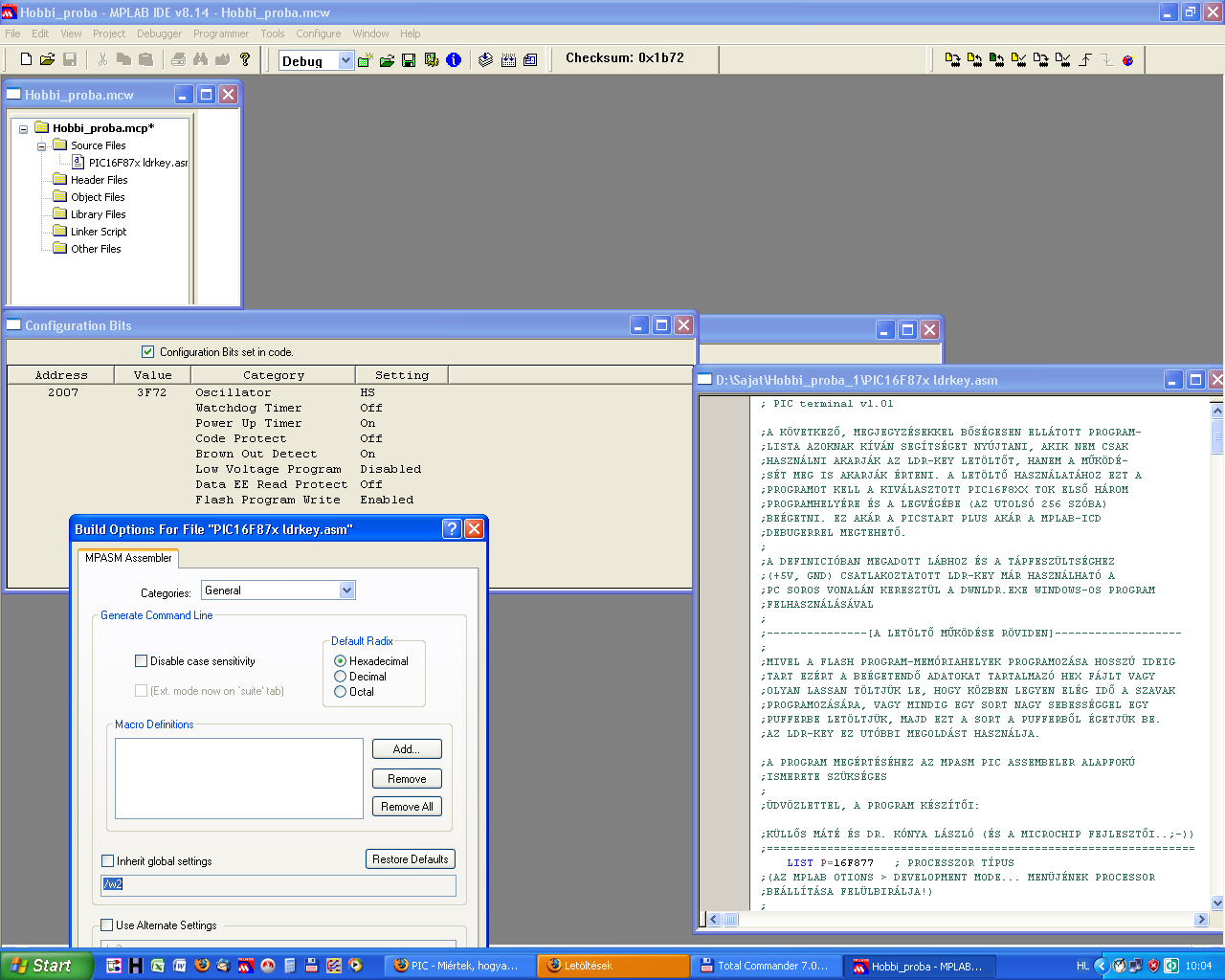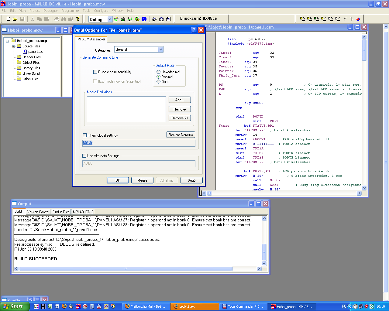 A korábban általad csatolt két fájlt lefordítottam(az LDRKEY-t és a panel1-t). LDRKEY-t betöltöttem, majd a panel1.hex-et rátöltöttem a downloaderrel. A letöltés hiba nélkül működött, 4..10..20MHz-es kristállyal HS beállítással! A programot természetesen nem tudtam kipróbálni, hogy fut-e, mivel nincs LCD-s próbaáramköröm, de a letöltés végén a LED 3-at villog, ami hibátlan folyamatot jelez! Összefoglalva, a programok lefordíthatóak, az LDRKEY hibátlan, és a letöltés végén nincs hiba egyik kristállyal sem!