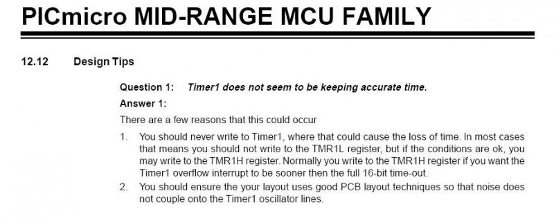 Szerintem csak az úgynevezett "Interrupt latency" időtől fog változni egy konkrét időpont pontossága. Persze ez az idő sok mindentől függ: Van-e olyan rész a programban, ahol a timer1 megszakítás tiltva van, van-e más megszakítás kezelés is a rendszerben. Ez az idő viszont csak egy-egy időpont kis csúszását jelenheti, nem halmozódik. A megszakítás kezelő függvény prológusa (feltéve, ha ugyan az fut le mindig / Timer1 az első a kiszolgálásban) legfeljebb csúszást okozhat, mert mindig ugyanannyi idő a futása. Az értékadás a felső byte-re vonatkozik, Szerintem 7.8125 ms csak elég a megszakítási rutin lefutására... Viszont van egy másik probléma. Körülményes a Timer1 írása. Az adatlap egyszerűen azt mondja, hogy le kell tiltani a timert az írás előtt és engedélyezni az írás után. E műveletek időigényét kellene a timer1 órajelének egységében figyelenbe venni a korrekciónál. A korrekció viszont az alsó bájtot érintené. Itt jobb az TMR1L+= c / addwf TMR1L,f utasítás használata. Az adatlap nem említi az írás utáni órajel kihagyást. A mellékletben a timer1 írására vonatkozó errata. Nem mindegy, mikor írjuk a timer regisztereit... Szerencsére van egy gyári tipp: A TMR1L írása nem ajánlott, de a TMR1H írható... Pont ez van az idézett kódban... Szia |