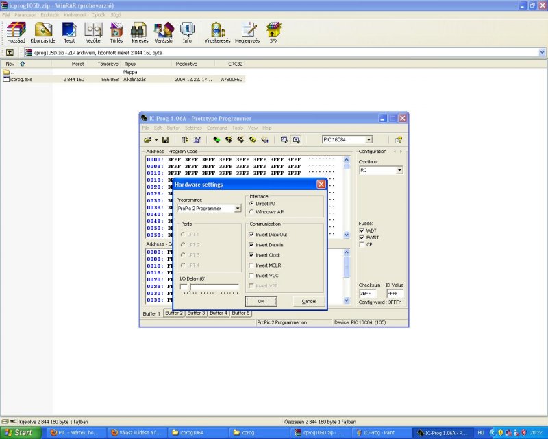 Az ic prog beállítása xp esetén: Programmer: Interface ProPic 2 Programmer Direct I/O X Windows API Ports Communication X LPT 1 X Invert Data Out X Invert Data IN X Invert Clock Invert MCLR Invert VCC settings->option menü ->misc ->xp engedélyezése