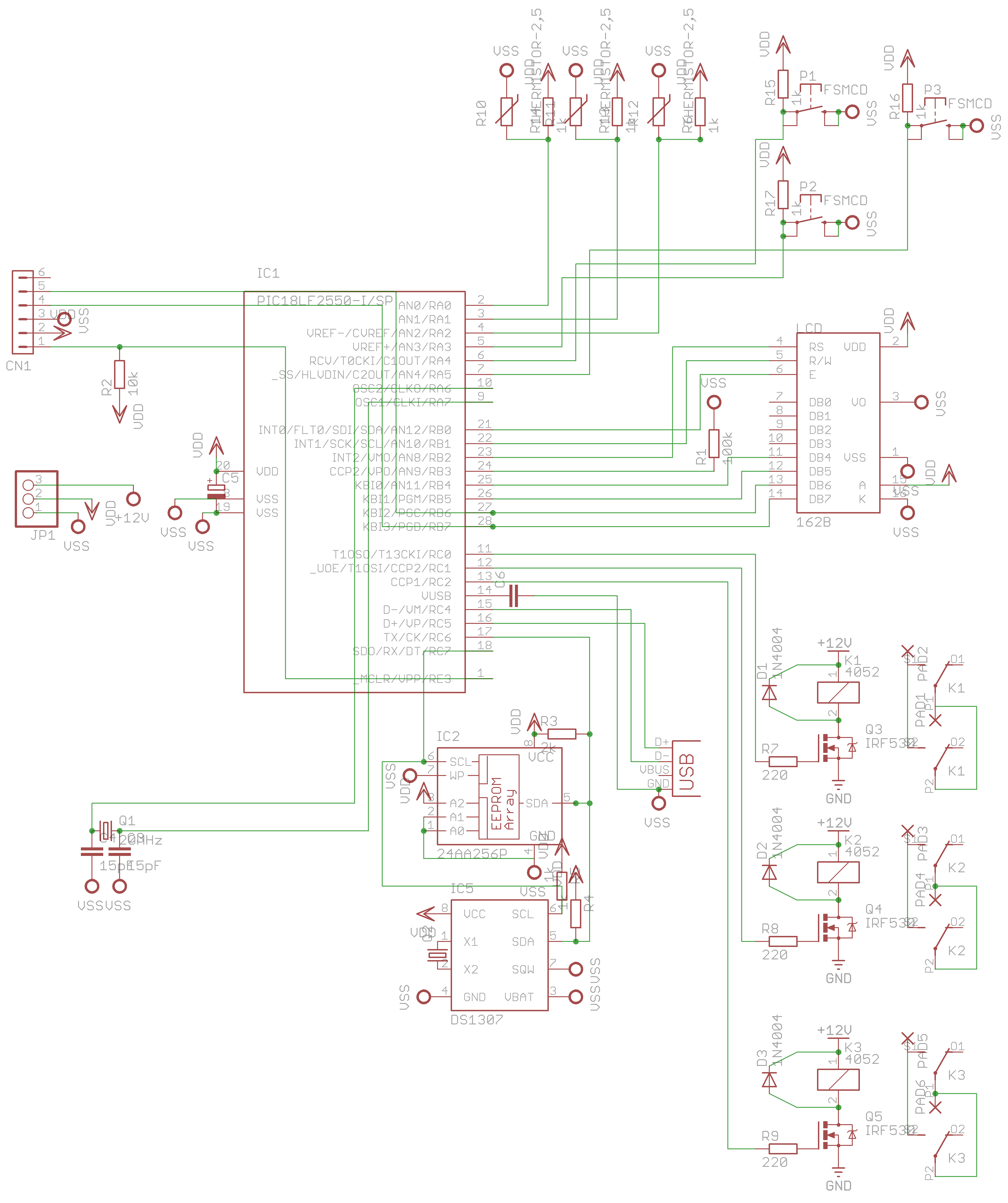 Néhány megjegyzésem lenne: - A 18F2550 -ben van MSSI modul, a soros órajel és adat az RB0 és RB1 portokon érhető el. Innen lenne célszerű az I2C EEPromot és az RTC-t kezelni. - Az LCD háttérvilágításához egy áramkorlátozó ellenállás kell. - A kontraszt beállításához egy 10k potenciómétert tegyél a VDD és VSS közé, a csúszkáról vedd le a VC feszültségét. - A relé kapcsoló fet-ek gate elektródáját célszerű lenne a föld felé egy ellenállással lehúzni, hogy kontroller nélküli méréseknél is le legyenek zárva. Szia