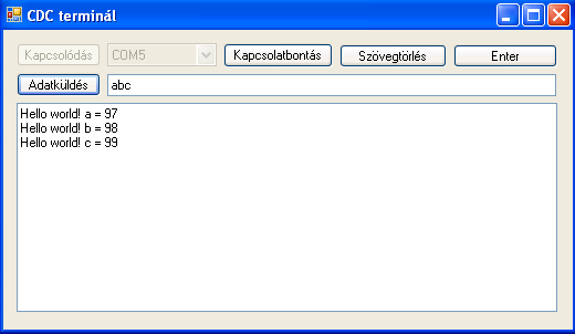 A fenti volt a pollingos eset (a lekérdezés az usb_CDC-getc() függvényben van elrejtve). Az interruptos eset sem sokkal bonyolultabb, csak definiálni kell az interrupt kiszolgáló eljárásokat: