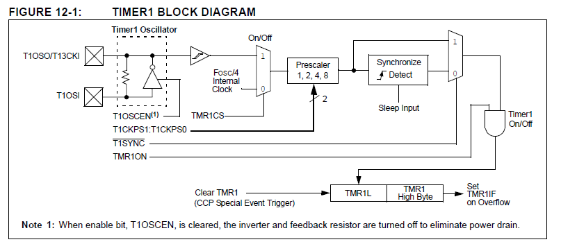 Csatoltam az adatlapból a T1CON regiszter leírását. T1CON=0b00001111; ezzel a beállítással dolgozik most. A 0. és 1. bit világos. A 2. bitet nem értem (lefordítani le tudom). Mihez szinkronizálna? 3. bit A külső oszcillátort engedi vagy nem engedi bejutni? Jól értelmezem a block diagram alapján? 4.-5. bit a bemenő órajelet osztja ezt vágom. 6. bit nem vágom 7. bit meg azt állítja hogy egy 16bites regiszterként vagy 2db 8bitesként kezelje a TIMER1et. Valaki elmondaná ami nem világos? Meg hogy akkor jól tippeltem azoknál a beállításnál amik nem voltak világosak?