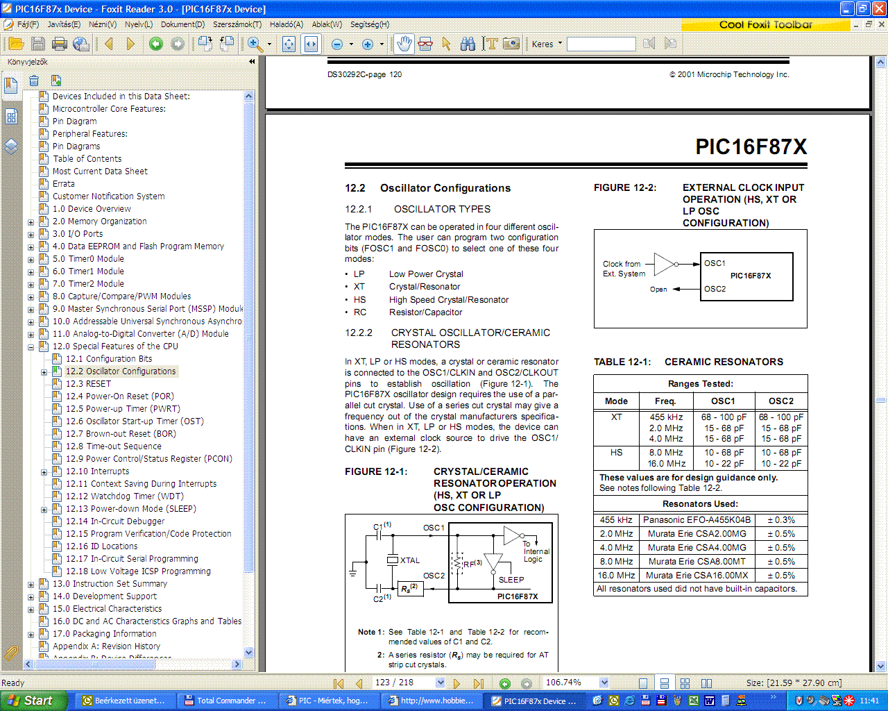 Szóval, Quartz -om van elvileg, küldök egy képet és az asm-et , megtévesztő , mert sok webes helyen quartz oszcillátor-t írnak, de úgy érzem keverik a neveket :S , vagy nem tudom .... ,de eléggé zavaró , hogy fogalmam sincs hogyan kéne, mert össze vissza írnak mindent, a probléma, hogy amint látni fogjátok megfelelően csináltam mindent, mert követtem a leírásokat, pickit2-t használok (egész olcsó ahhoz képest, hogy a config file változtatásával mindent lehet programozni vele) , megnéztem, hogy visszaellenőrzi-e a beégetet cuccot és elvileg okés. a kondik nélkül sem megy , próbáltam , van egy nagyobb kondi a + és - közt még, de amúgy honnan tudom, hogy melyik lábát kell a quart-nak melyikre tenni? :O , mer gondolm, ha rosszul kötöném be akkor tönkretenné nem? meg persze tudnom kéne, hogy mekkora feszkóval megy .... és a gyártó oldalát nem tudtam megtalálni , de megkérdem a boltban ahol vettem A .asm-nél mplab-al égettem, az osc mindíg hs-re volt állítva 4 mzh-nél , de állítólag az is megfelel a 16f873-masnak , általában az mplab-ban adtam meg. Lehet, hogy mind2 pic rossz? :O , mer beégetem őket, csak nem akarnak működni. A kontroller alatt a Vdd-t érted? mert amúgy 5.5 volt megy be a 873-masba, mert a doksiban aza max faszkó . Köszi a válaszokat!