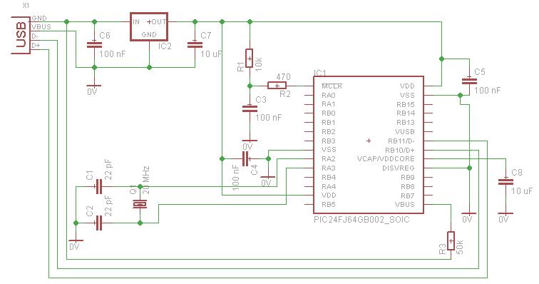 Az adatlap 100nF-ot ír a Vusb és a föld közé, viszont én ránéztem a PIC24F Starter Kit panel kapcsolási rajzára, ott 1µF volt, de lehet, hogy csak a Host funkció miatt. Mindenesetre egy 100 nF-os kerámiát én azért tennék oda. A többi jónak tűnik, a regulátor is jól van bekötve, ilyen az ajánlott? Én a bemenetére azért tennék egy 10-100 µF elkót, a kimenetre meg még egy 100 nF kerámiát.