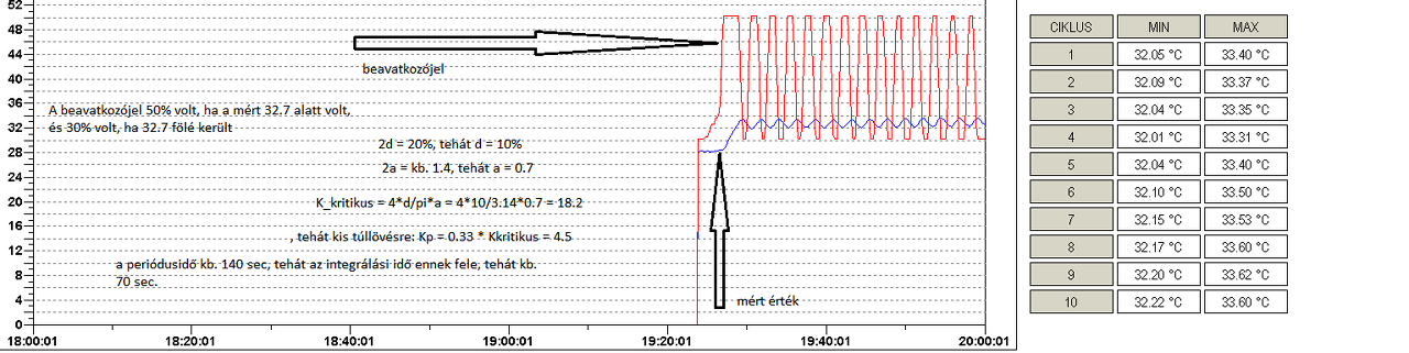 Egy fűtőtest hőmérsékletét szabályozom. Nos kipróbáltam. Addig növeltem a P-t (2-essével 0-32ig), amíg el nem kezd oszcillálni. Sajnos elértem 32-ig, tehát nem oszcillált. Nagyon kis mértékben viszont igen, kb 1-2 volt az amplitudó és 1 másodperc a periódusidő (vagy 0,75).