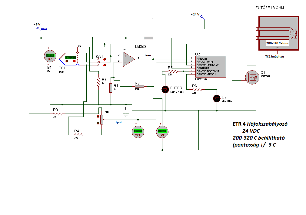 Nekem is szükségem lett volna egy PID-es szabályozóra, de a nagy matematikához már kevés vagyok. Adva volt egy 24 Voltos fűtőfej ( 8 Ohm) és beépítve egy hőelem. A mellékelt rajz szerint csináltam meg a vezérlést, igaz 16f690-nel teszteltem a pidpic.pbp programmal. Gyakorlatilag az előírt hőmérséklet 80%-áig felfűtöttem a fejet, és az előírt hő és mért hő differenciájával egy lassú PWM szerű vezérlést írtam. A fej 30 mp alatt eléri a 80 %-ot és automatikusan "rásimul" egy kb 96 %-os értékre. kb. 15 mp után ezt az értéket stabilan tartja. Ezt a hőfokbeállításnál figyelembe kell vennünk, vagy a potmétert utólag skálázhatjuk. A fejnek kicsi a hőtehetetlensége ezért, 100 ms nagyságrendű mintavételezéssel dolgoztam. Szerintem alkalmas lehet nagyobb tartályok, vagy akár helyiségek hőfokszabályozására is, de a mintavételezési ás beavatkozási időket a rendszer tehetetlenségéhez kell igazítani. Nem nevezném PID-nel, mert egy differenciál szabályozás, de a rendszer kiegyenlíti önmagát. Ha valaki tudna egy egyszerübb "mezei polgár" által is megszerkeszthető algoritmust, azt ezen a rendszeren szívesen kipróbálnám. Üdv mgy