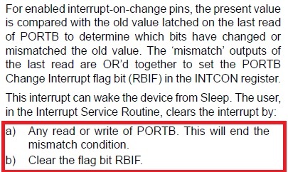 Az RBIF törlése asm-ben is a PORTB olvasására történik. Ha valamiért nem törlődik, akkor újra belép a megszakításba: ez asm-ül és C-ül is így van