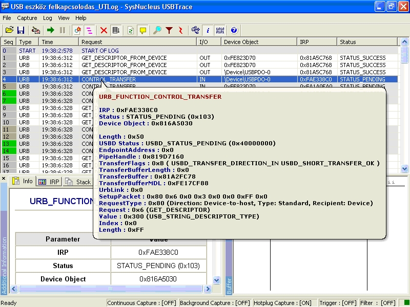 Én ezt láttam az USB eszköz felcsatlakozásáakor utolsó forgalomként. (Bocsi, de most látosm, hogy 120 keret helyett csak 114 volt! Bocsi, de mi az alapbeálltás, ha be kell kapcsolni a "capture continously" opciót?