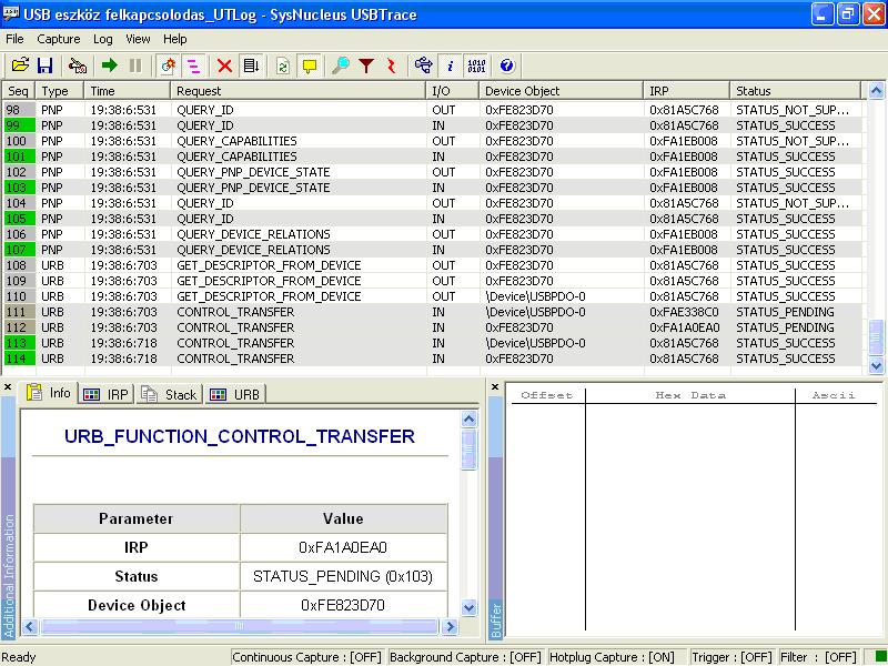 Ezekben a blokkokban kihasználtságtól függően csak néhányban lesz hasznos adatátvitel (a többi tök üres). A sorokat végigböködve a buffer ablakban megjelennek az adatcsomagok tartalma....Ha csak a hasznos adattartalmat hordozó átvitelt akarjátok látni akkor a trigert kell bekapcsolni, ott szintén bulk_or_interrupt_transfer legyen bepipálva, a Status=success, Direction=IN&OUT, Data=With data, Activate trigger pipa ok talán segít valamit.... plusz a melléklet is hasznos lehet kezdéshez