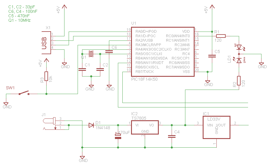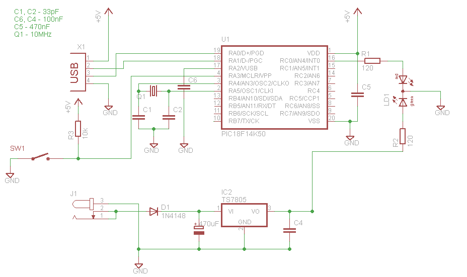 vagy miért nem minden a dugasztápról jár, az usb 5v-ja meg elfelejtve? a 4148 szerintem még annyi áramot sem tud mint az usb port... a dugasztáp ugye dc, a dióda csak védelemnek van, nem egyutas egyenirányítónak? 7805 bemenetére is tennék 100nF-ot, gondolom a c4 is 100nF kerámia