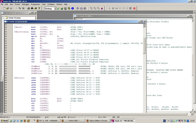 Teszteléshez a PIC24 saját 2 db CAN moduljait használom tehát kiküldöm 1-en, veszem 2-n... Már működik patentül, DMA meg minden. Most éppen pofásítom a programot. A cél az autó teljes ECAN busz-ra fűzése. Egy itteni sráccal "dolgozom" össze. Bár ő nem sűrűn ér rá, de inspirál. Szóval ez van. Nem tartom magam nagy fejnek, inkább kitartó vagyok. Munka mellett 4 hónapja nyomom a CAN modult igaz közben rengeteg járulékos melót csináltam, és ne feledkezzünk meg a főállásról... ![]() Egyébként egy történet arról hogy mennyire kell az ASM, és milyen jó a microchip support-ja. A ECAN busz fejlesztése során kiderült hogy az ECAN regiszterei a PIC24-ben bankolva vannak. Illteve ezt tudtam a reference manual-ból. Egy bit (WIN) állítgatásával lehet lapozni. Aztán közben kiderült hogy vagy 6 regiszter noha léptetett végrehajtás során megváltozik (mert visszaolvasva kiderült hogy tényleg) a Watch window-ban nem látszott. Peírva a 24/7 Technical Support-ba a következő (most megjelent) 8.14 Mpalb verzióban kijavították az ECAN modul ilyen jellegű hibáját. Sűrű köszönetek közepette köszönték meg a segítséget. S noha próbáltak C30-ra téríteni (marketing duma), megmondtam nekik hogy egy igazi férfi asm-ben programoz, ahogy a zászlóaljparancsnokom mondta vala... ![]() Na ez az amit az ember C-vel észre se vesz. Elsiklik fölötte. Mint aki jól végezte a dolgát. S lövés sincs róla hogy van e hiba vagy nincs. Csak a remény...Ezért kezelhetetlenek a programok.... Idézet: „Na ez az amit az ember C-vel észre se vesz. Elsiklik fölötte. Mint aki jól végezte a dolgát. S lövés sincs róla hogy van e hiba vagy nincs. Csak a remény...Ezért kezelhetetlenek a programok...” 150%-osan egyetértek ezzel. Idézet: „addig ugyanezt AVR esetén 20, azaz húsz utasítással tudjuk elérni. Nem mindegy, hogy portláb, GPR, ... Sajnos már megkopottak az emlékeim, de ha jól emlékszem, van amit csak maszkolni lehet, tovább rontva a helyzetet. Ugyanez igaz az adatmozgatásra is, amíg a PIC néhány MOV utasítással mindent megcsinál, addig AVR esetén ugyanerre van LOAD, STORE, MOV, IN, OUT” ...20 utasítás !? tényleg nagyon régen volt ,az adatmozgatás elkülönítése sztem olvashatóbbá teszi a programot de akinek ez nem tetszik Atmel-nél van fennt egy macro erre az esetre....
